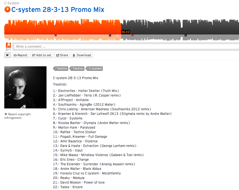 We would like to thank C-System for the support of Nicolas Bacher's track 'Olympia' in the 'Andre Walter' Remix Version at his march promotion mix. Nicolas's Single will be released on the 16.04.2013 with great remixes by Andre Walter (Stigmata), Sync Therapy, Peat Noise and Mike Turrento. Early support of Sam Paganini, Meiko, Volt & Vintage, Vegim, Electrorites, Horn Porn and many many more. Check C-System's banging techno set!!! |
