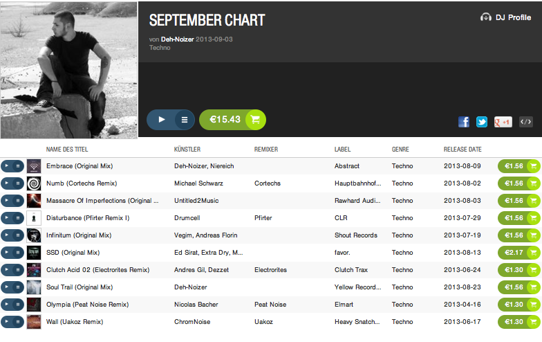 DJ & Producer Deh-Noizer (Kombination Research, Impact Mechanics, Brood Audio, Torsten Kanzler Rec) placed Nicolas Bacher's track 'Olympia' in the Peat Noise Remix Version on his 'BEATPORT - SEPTEMBER CHARTS 2013'. This great track is available from the 16nd of April 2013 on several download stores, e.g. Beatport, Juno Download, Amazon, Wasabeat and many more. This EP already got huge support of D.A.V.E The Drummer, Spiros Kaloumenos, Ryuji Takeuchi, Sam Paganini, Patrick DSP, Sisko Electrofanatik and many more. We would like to thank Deh-Noizer for his support. |