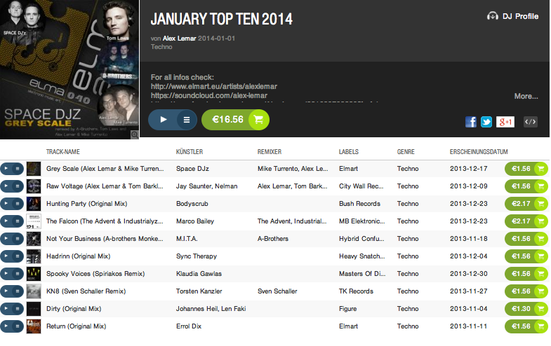 elmart DJ & Producer Alex Lemar (NB Records, Heavy Snatch Records, elmart) placed Space DJz's track 'Grey Scale' in the Alex Lemar & Mike Turrento Remix Version and Errol Dix's track 'Return' on his 'BEATPORT - JANUARY TOP TEN 2014'. These great track are available on several download stores, e.g. Beatport, Juno Download, Amazon, Wasabeat and many more. Beside our elmart tracks you can check out tracks by Marco Bailey, Bodyscrub, Johannes Heil, Len Faki and many more. We would like to thank Alex for his support. |