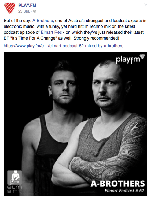 We want to thank Play.fm for their huge support on our latest elmart podcast with the A-Brothers. Play.fm selected our set as 'Set of the day' (03.06.2015) on their website.