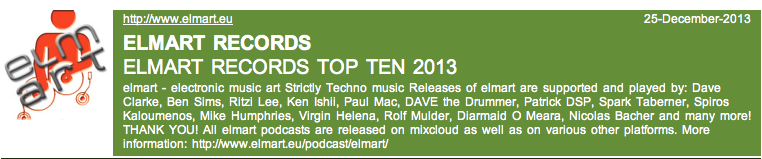 Thank you for your huge support 2013. We had many great releases with international and national artists and got huge feedbacks and support by artists like Dave Clarke, Klaudia Gawlas, Felix Kröcher, Joseph Capriati, Sam Paganini and many many more. We round up this charts with one upcoming release of Bunk3er R3cords head Twist3d and one elmart classic of Mike Turrento called 'Diving'. We wish everybody a happy and successful new year. |