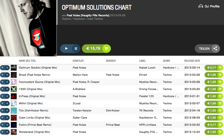 DJ, Producer & Naughty Pills Records label owner Peat Noise placed his remix of Martyn Hare's track 'Brood' on his 'OPTIMUM SOLUTIONS CHARTS' of March. This great track is available starting from the 26th of March 2013 on several download stores, e.g. Beatport, Juno Download, Amazon, Wasabeat and many more. We would like to thank Peat Noise for his support. |