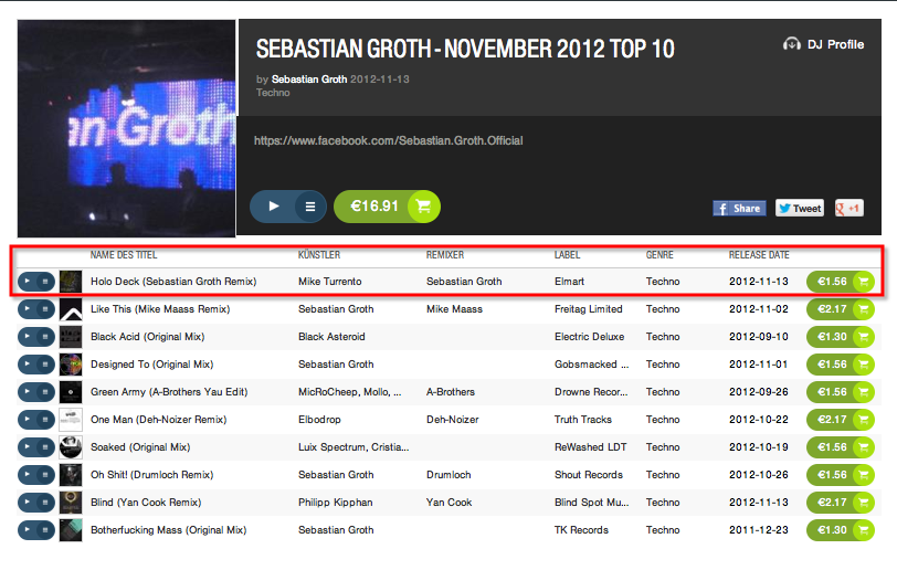 German DJ & Producer Sebastian Groth placed his remix of Mike Turrento's single 'Holo Deck' on his Top Ten Charts of November. His track is on the first place and starting from the 13th of November 2012 the release is available on several download stores, e.g. Beatport, Juno Download, Amazon, Wasabeat and many more. We would like to thank Sebastian for his support.
