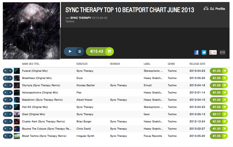 DJ & Producer Duo Sync Therapy (Heavy Snatch Records) placed their remix of Nicolas Bacher's track 'Olympia' on their 'BEATPORT CHART - JUNE 2013'. This great track is available starting from the 16tht of April 2013 on several download stores, e.g. Beatport, Juno Download, Amazon, Wasabeat and many more. We would like to thank Sync Therapy for their support.